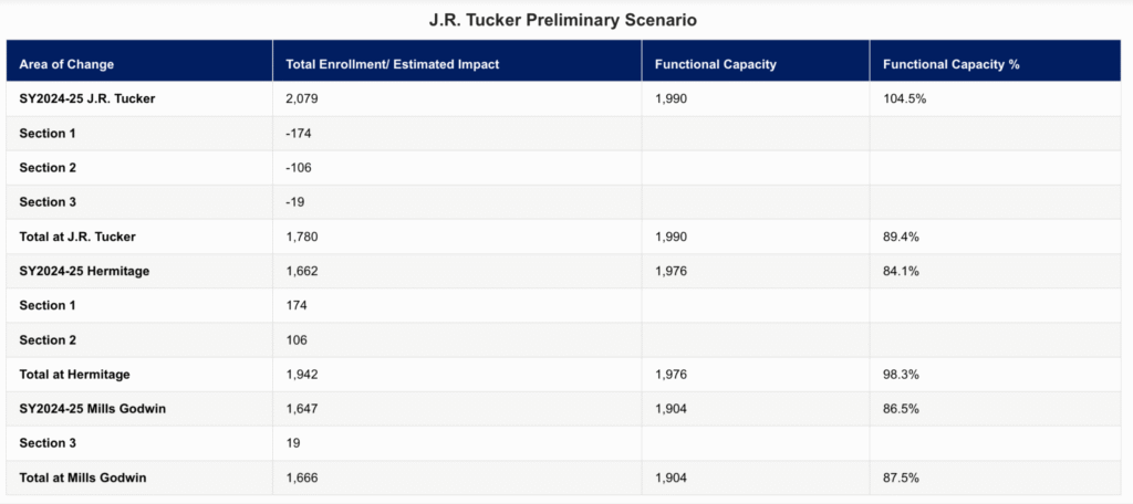 - “This scenario is designed to bring capacity relief to J.R. Tucker High School, which had a functional capacity of 104% during the 2024-25 school year.