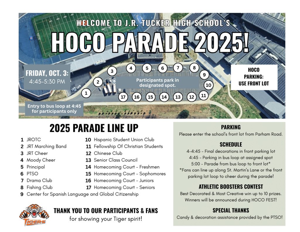 5:00-5:30 PM: PARADE Please join us for our Homecoming parade beginning at 5:00 pm on Friday, October 3! We hope to see you lining St. Martin’s Lane and our Tucker front parking lot loop cheering for your Tigers; don’t miss the fun or the candy flying your way! Candy & decoration grants offered by PTSO; Contest for Best Decorated and Most Creative with prizes from Athletic Boosters.